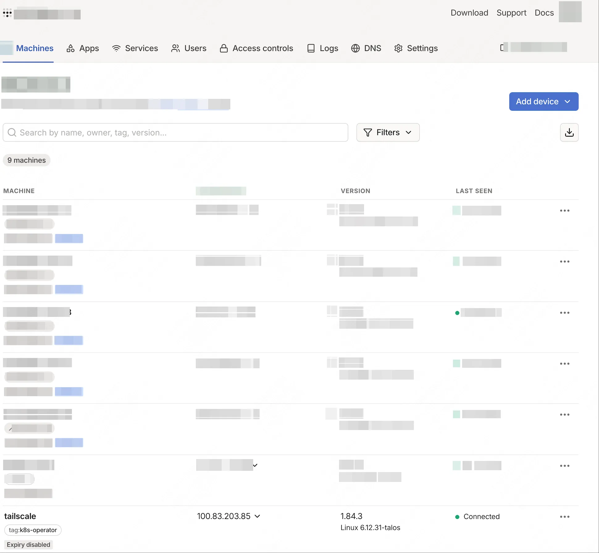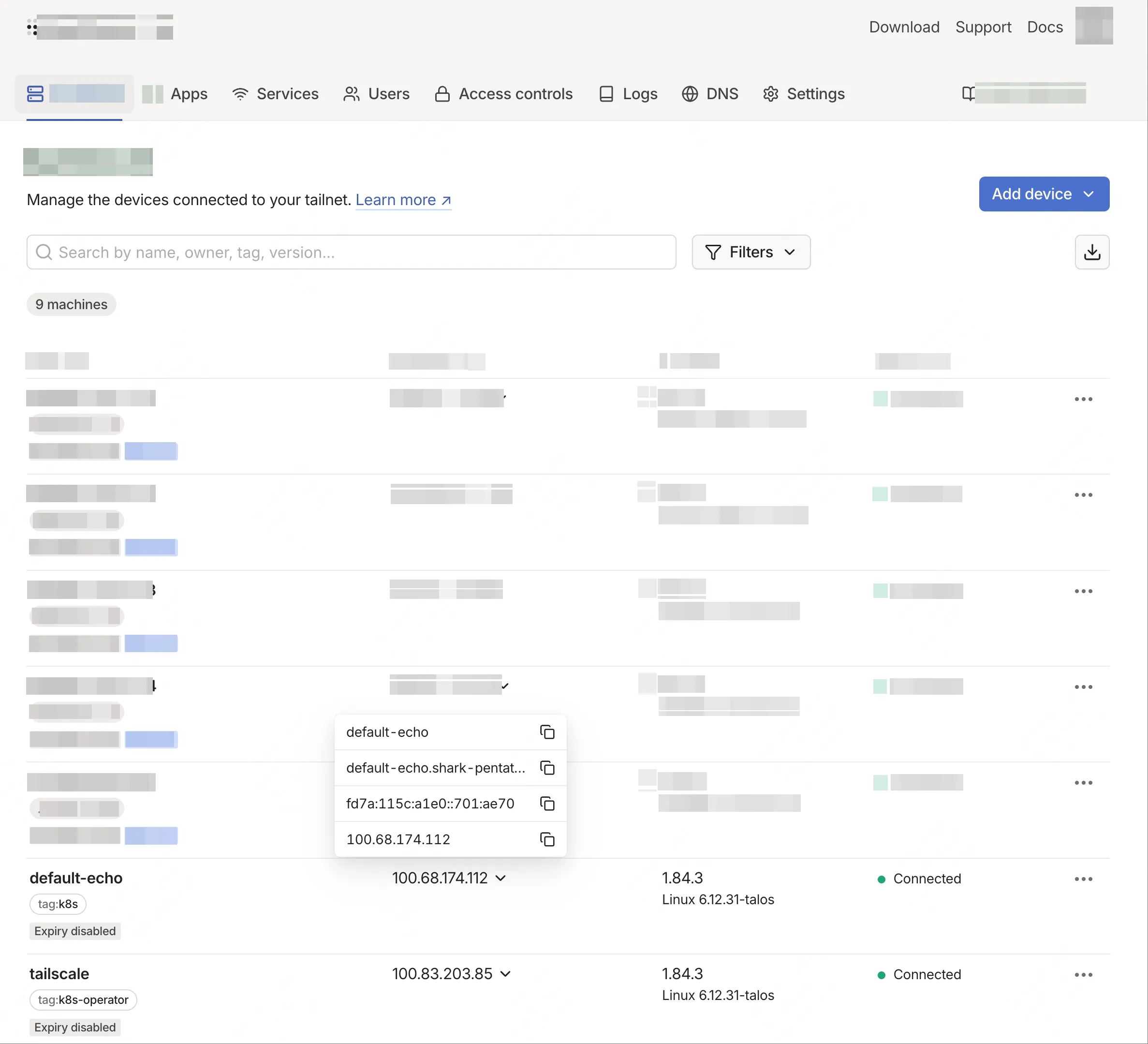 如果成功,会在 Tailscale Machines 页面出现一个新节点,这个节点就是对应的 Kubernetes 服务。