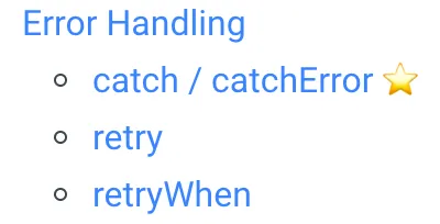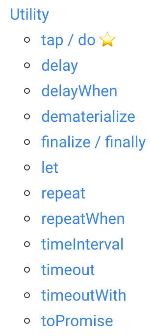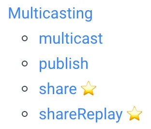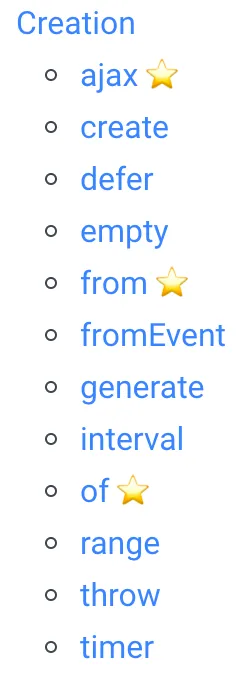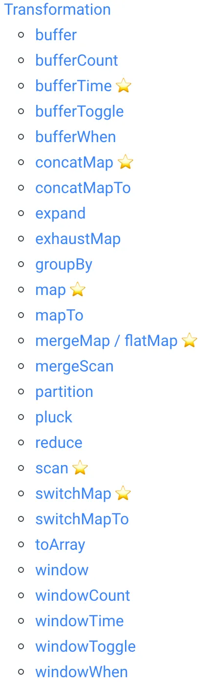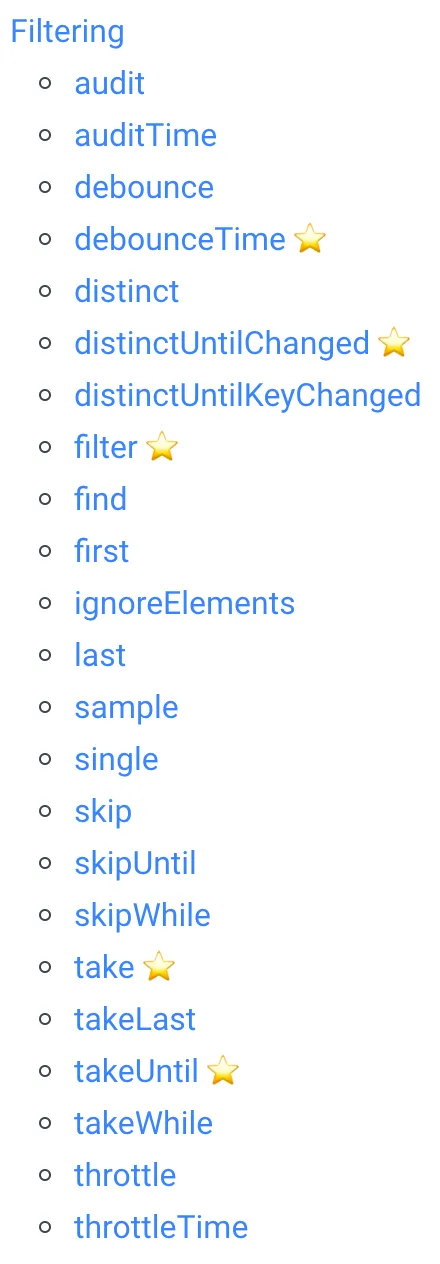 RxJS 操作符学习这块建议先从上面列举的操作符中包含星号的开始,每个操作符和乐高积木差不多。将他们组合起来的威力是非常巨大的。
